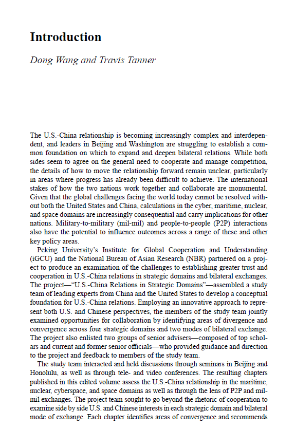 《跨越“修昔底德陷阱”:战略领域的中美关系》(Avoiding the ‘Thucydides Trap’: U.S.-China Relations in Strategic Domains)是北京大学中外人文交流研究基地和美国著名智库“亚洲研究所(NBR)”共同合作的成果。课题汇聚了来自中美几十家顶尖研究机构和智库的学者,经过数次会议研讨、大量调研和广泛咨询,历时数年得以成书。本书由北京大学国际关系学院教授、中外人文交流研究基地执行主任王栋和时任中美强基金会(The U.S.-China Strong Foundation)主席谭俊辉(Travis Tanner)共同主编,涵盖中美关系的核、太空、网络、海洋、两军关系和人文交流等六大战略领域问题,每章由一位中方作者和一位美方作者共同执笔完成。