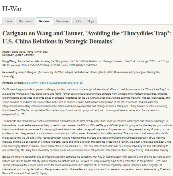 Citation: Joseph Carignan. Review of Wang, Dong; Tanner, Travis, eds., Avoiding the ‘Thucydides Trap’: U.S.-China Relations in Strategic Domains. H-War, H-Net Reviews. March, 2022. URL: https://www.h-net.org/reviews/showrev.php?id=57367