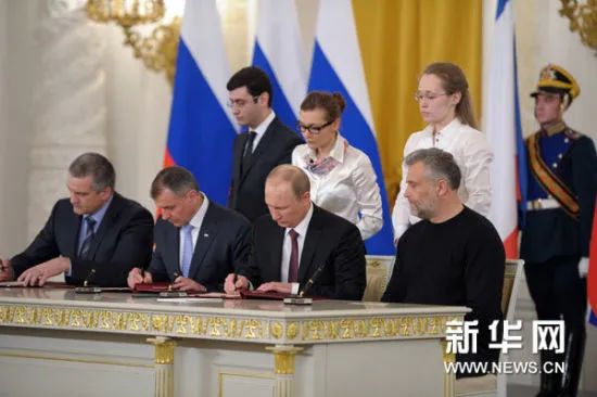2014年3月18日,俄罗斯总统普京在莫斯科克里姆林宫同克里米亚及塞瓦斯托波尔代表签署条约,允许克里米亚和塞瓦斯托波尔以联邦主体身份加入俄罗斯联邦。(图源/新华网)