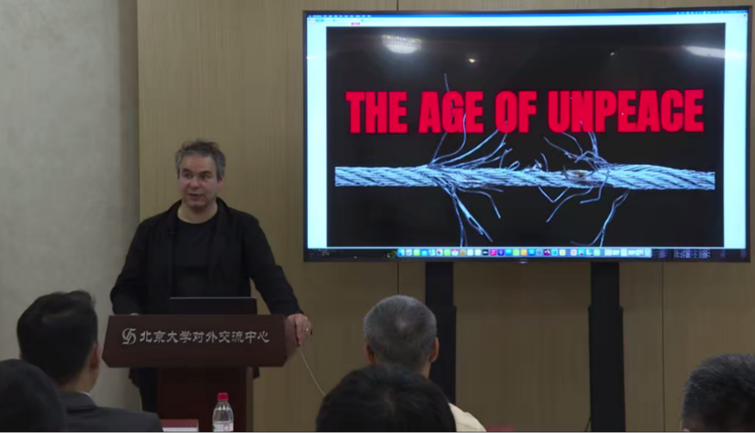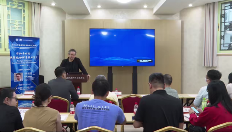 北京大学“临湖智库国际讲坛”第三讲于2023年7月5日上午在未名湖湖心亭岛亭会议室举行。著名智库欧洲对外关系委员会会长、联合创始人马克·伦纳德向与会嘉宾与学生代表介绍了他的最新著作——《非和平时代:联结性如何导致冲突》一书的主要内容。该书于2022年出版,曾被英国《金融时报》评为“年度书籍”。北京大学国际关系学院助理教授、北大中外人文交流研究基地秘书长祁昊天主持了讲座。