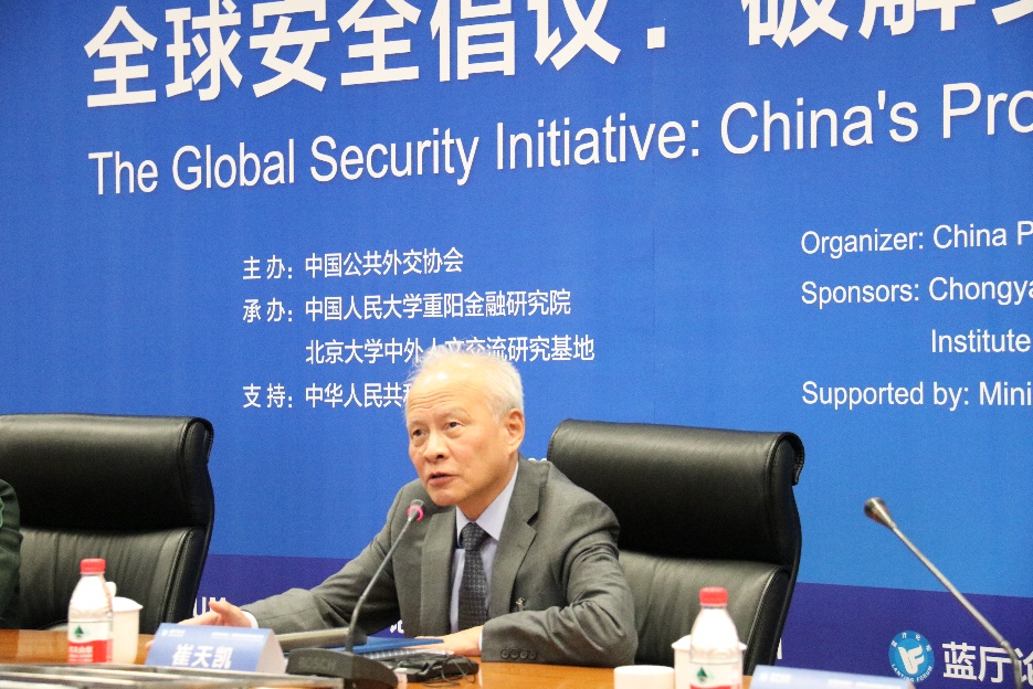 2023年2月21日上午,由中国公共外交协会主办,北京大学中外人文交流研究基地、中国人民大学重阳金融研究院承办的“全球安全倡议:破解安全困境的中国方案”蓝厅论坛在外交部新闻发言厅举行。中外数十位原政要、专家学者及各界代表参加此次论坛,共同探讨当今全球安全困境的解决方案。中国外交部长秦刚出席论坛开幕式并发表主旨演讲,联合国原秘书长潘基文、斯洛文尼亚原总统图尔克(Danilo Türk)发表视频致辞。论坛开幕式由中国公共外交协会会长吴海龙主持。论坛同时发布了《全球安全倡议概念文件》,详细阐释了全球安全倡议的核心理念和原则,并明确了重点合作方向和平台机制。