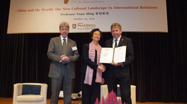 2015-10-302015年10月26日至29日,北京大学美国研究中心主任、中美人文交流研究基地执行委员会委员袁明教授应邀访问香港大学,并主讲2015年度“范叔钦纪念讲座”。29日晚,袁明教授在香港大学黄丽松讲堂发表了题为“中国与世界:国际关系中的新文化景观”的重要演讲。演讲会开始前,香港大学校长马斐森教授亲自向袁明教授颁授香港大学荣誉教授证书,并致欢迎词,这是港大历史上首次由校长举行公开仪式颁授荣誉教授衔。香港大学社会科学学...