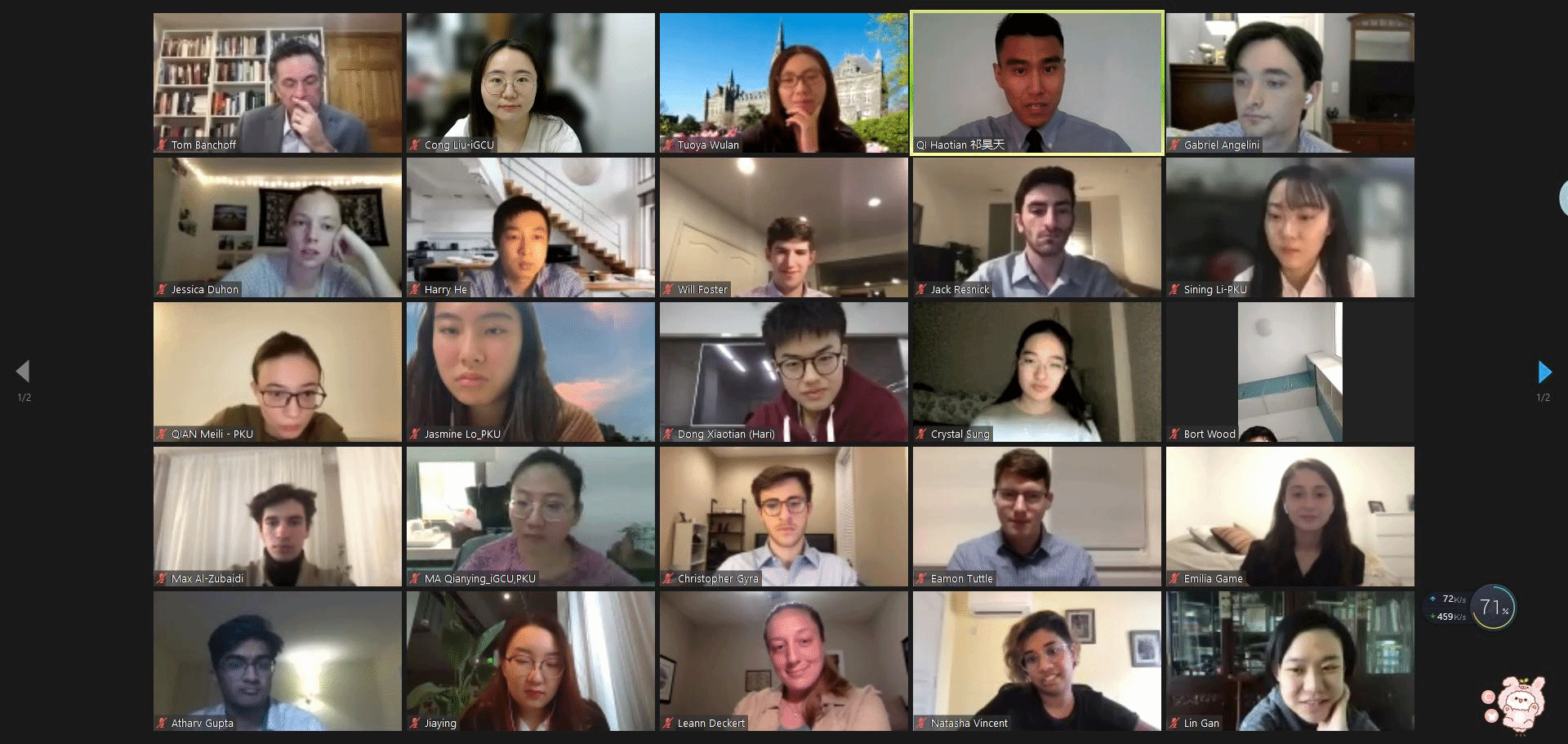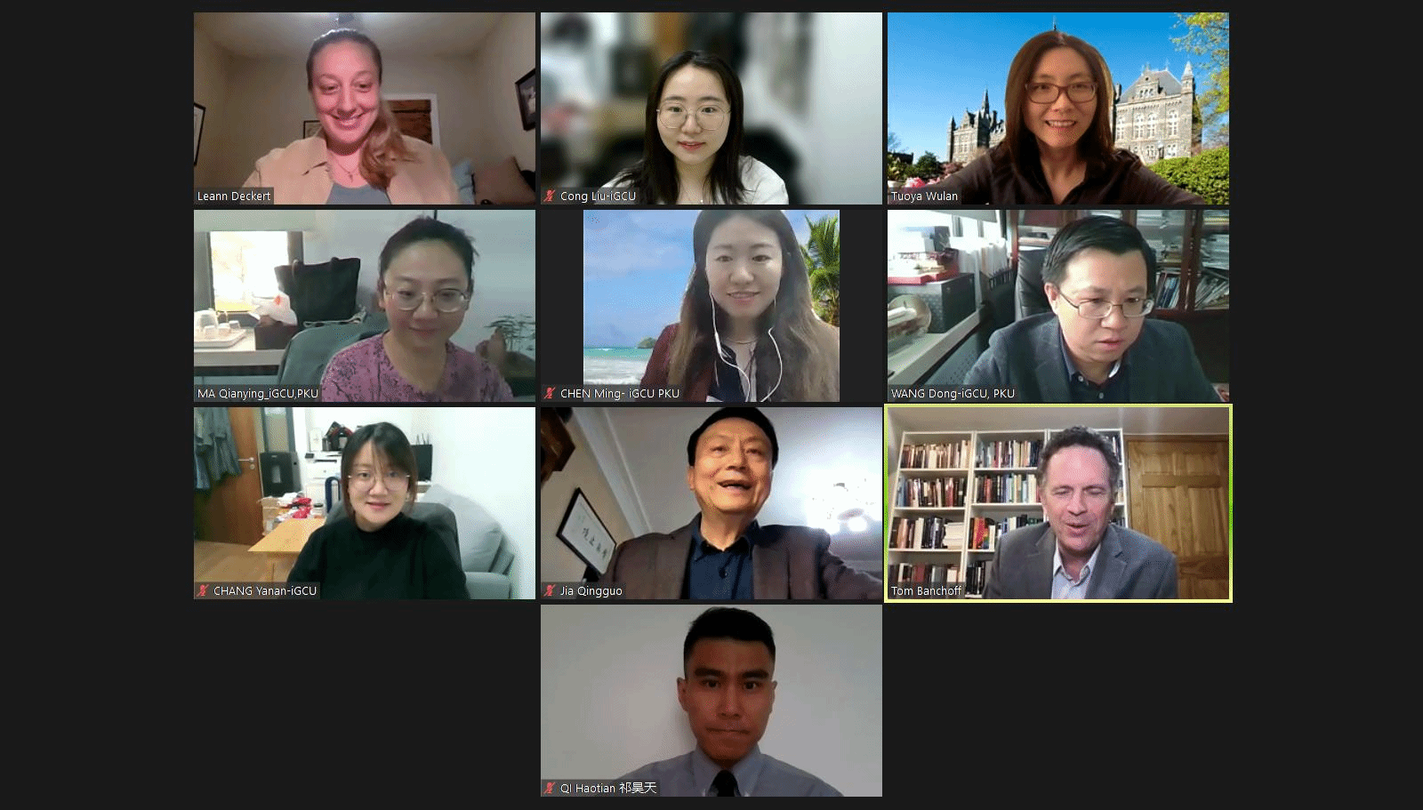 2021年4月16日,北京大学中外人文交流研究基地与乔治城大学美中全球议题对话项目合作举办“中美关系的未来:全球发展与文化对话”活动在线上举行。来自北京大学和乔治城大学的23名同学相聚云端,共同围绕中美关系和全球发展的重要议题深入交流,碰撞思想火花。乔治城大学副校长、教授托马斯·班科夫(Thomas Banchoff),全国政协常委、北京大学国际关系学院原院长、教授、中外人文交流研究基地主任贾庆国分别代表主办方致辞。