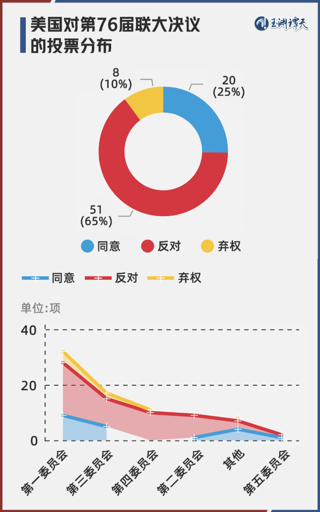 事实上,不只是中国台湾问题,美国在面对其他问题时,也大都是国际准则的破坏者和挑战者。这一点,从联合国大会决议的投票中,就能看出端倪。上一届联合国大会通过的决议中,有65%的决议,美国都投了反对票。