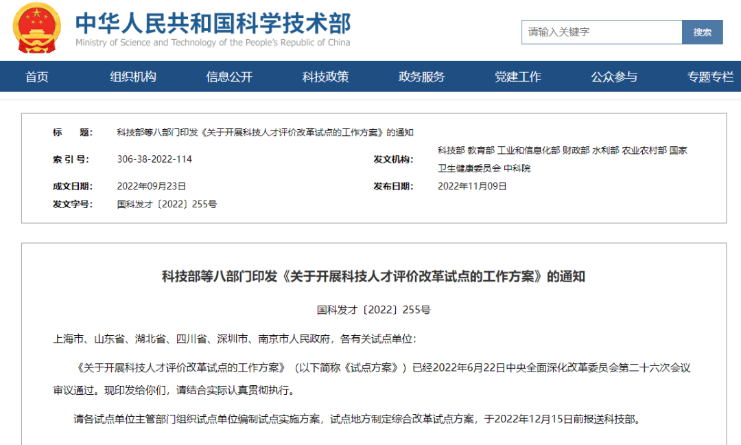 八、科技部等八部门印发《关于开展科技人才评价改革试点的工作方案》