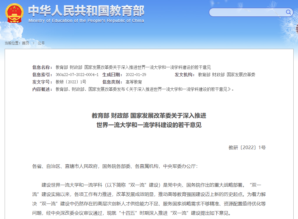 一、教育部、财政部、国家发展改革委发布《关于深入推进世界一流大学和一流学科建设的若干意见》