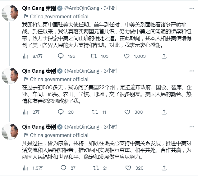 凡是过往,皆为序章。我将一如既往地关心支持中美关系发展,推进中美对话交流和人民相知相亲,推动两国实现相互尊重、和平共处、合作共赢,为两国人民福祉和世界和平、稳定和发展做出应尽努力。