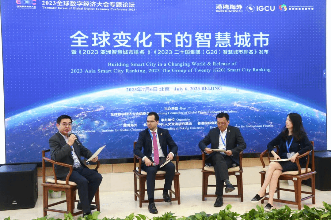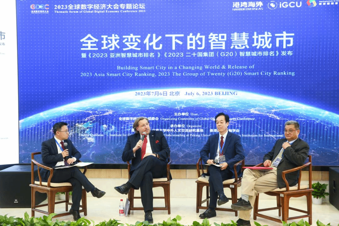 2023年7月6日上午,由北京全球数字经济大会组委会主办,港湾海外、北京大学中外人文交流研究基地和香港国际金融学会共同承办的2023全球数字经济大会“全球变化下的智慧城市”专题论坛在北京大学燕京学堂举行。北京大学社会科学部部长强世功教授、北京市经济与信息化局副局长彭雪海先生以及北京大学国际关系学院院长唐士其教授出席论坛并致辞。吉尔吉斯斯坦前总理卓奥玛尔特·奥托巴耶夫(Djoomart Otorbaev)先生、北京大学校务委员会副主任于鸿君教授、埃及前外交部长纳比尔·法赫米(Nabil Fahmy)先生作主旨发言。论坛开场部分由北京大学国际关系学院教授、中外人文交流研究基地执行主任王栋主持。