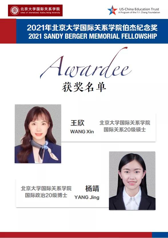感谢各位同学对伯杰纪念奖学金的关注与支持!经由北京大学中外人文交流研究基地组织学者、专家,会同中美教育基金会代表以及苏珊·伯杰(Mrs. Susan Berger)女士对诸位候选人的多轮联合筛选后,两位品德优异、成绩突出、具有扎实的学术专业基础及清晰合理的未来职业规划的同学通过最终评选,成为2021年北京大学国际关系学院伯杰纪念奖学金获奖者。