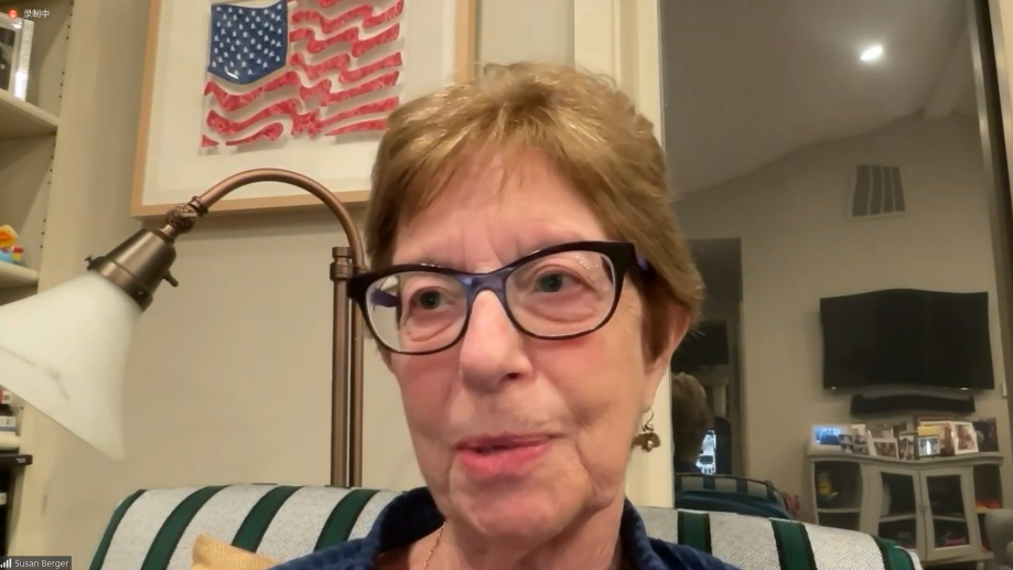 美国前国家安全事务助理萨缪尔·桑迪·伯杰先生遗孀苏珊·伯杰(Mrs. Susan Berger)女士代表伯杰家族向获奖学子表示祝贺,并对参与伯杰纪念奖学金相关工作的各位专家学者及双方工作人员表示感谢。她表示,如果先生还在世,看到各位奖学金获得者,看到中国青年人对中美人文交流高涨的热情和做出的贡献,一定会感到十分欣喜与慰藉。