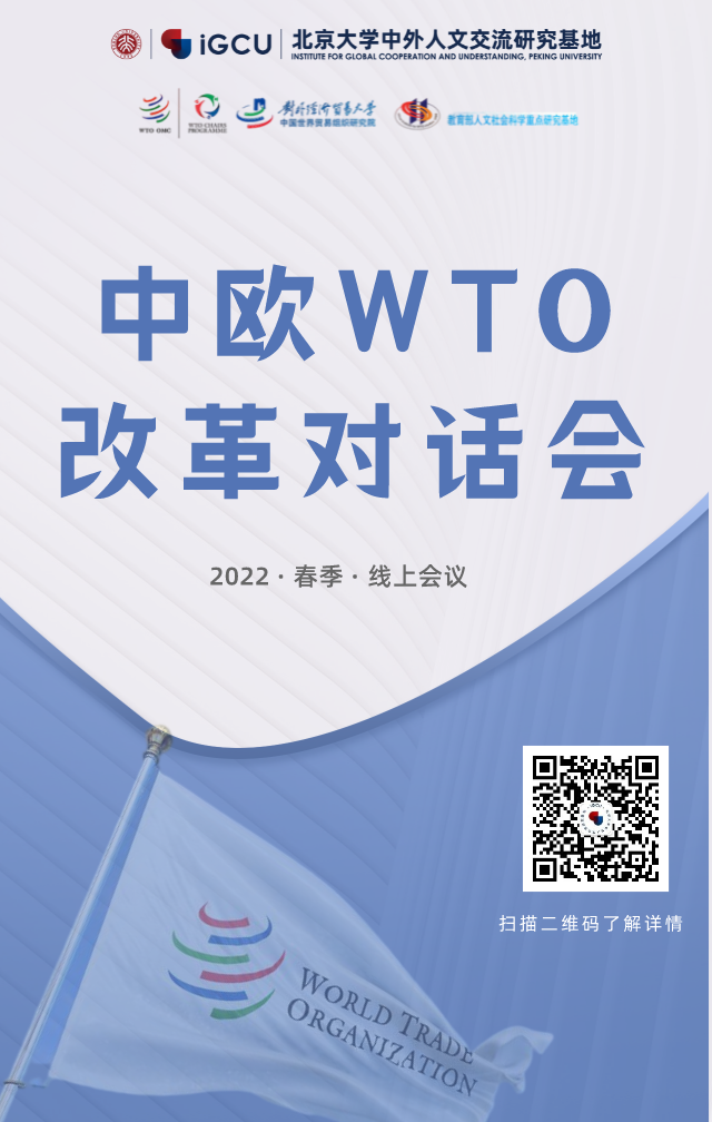 由北京大学中外人文交流研究基地(iGCU)、对外经济贸易大学中国世界贸易组织研究院(CIWTO)共同主办的中欧WTO改革对话会将于2022年春季在线上举行。在两天的会议中,来自中欧的二十多位学者将就“重振WTO谈判功能”、“补贴透明度和中美地方补贴实践”、“WTO争端解决机制危机和中欧合作”、“如何认识和处理发展中国家特殊和差别待遇问题”、“WTO法下的国家安全和其他非贸易议题”、“数字贸易规则的制定”、“气候变化和WTO改革”十二个专题展开讨论。