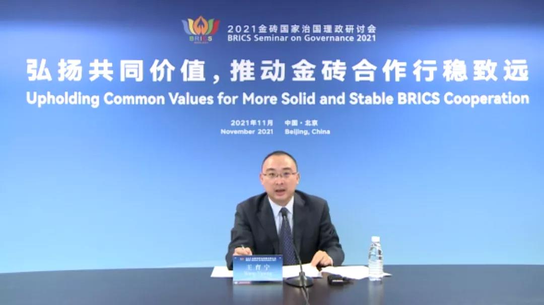 11月2日-3日,“2021年金砖国家治国理政研讨会”在北京召开,来自金砖五国的150余名代表围绕“凝聚共识,强化信心,助力命运与共的金砖合作”这一主题,以线上线下相结合的方式深入交流治国理政经验。中共中央宣传部副部长、国务院新闻办公室主任徐麟出席开幕式并讲话。中国外文局副局长兼总编辑高岸明主持开幕式。北京大学社会科学部副部长、国际关系学院教授、中外人文交流研究基地执行主任王栋受邀出席开幕式。