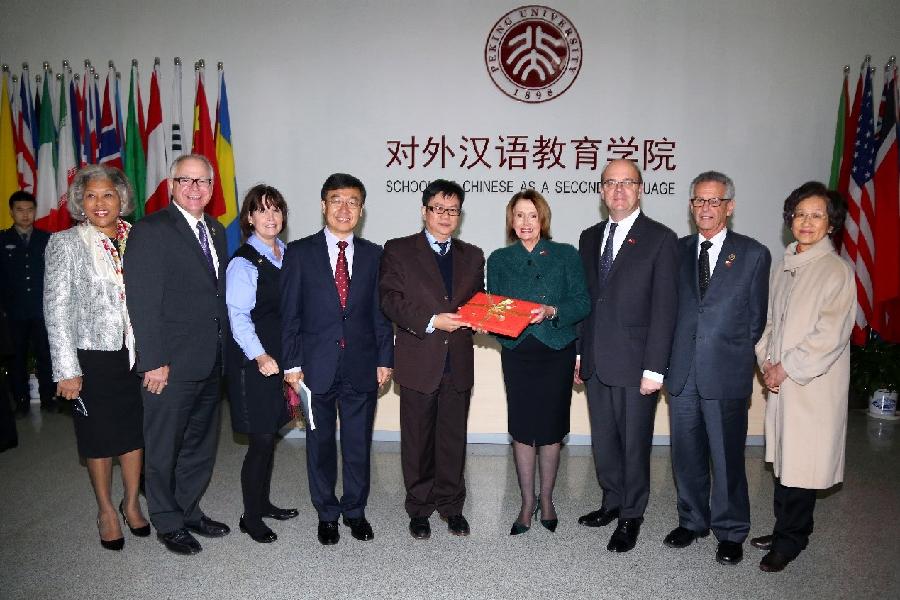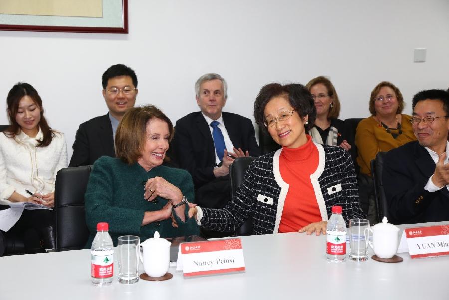 2015年11月13日,美国众议院少数党领袖佩洛西率民主党议员代表团访问北大,与北京大学师生代表围绕中美关系特别是气候变化主题进行座谈。全国人大副秘书长陈国民陪同参加座谈。座谈会由北京大学美国研究中心主任、中美人文交流研究基地执行委员会委员袁明教授主持,北京大学国际关系学院张海滨教授和来自北京大学法学院、燕京学堂、及国际关系学院的学生代表参加了座谈会。