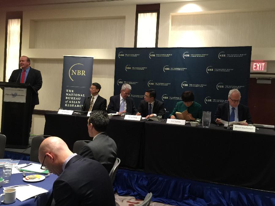 4月19日的报告会首先由北京大学国际关系学院院长、中美人文交流研究基地执行主任贾庆国教授和全美亚洲研究所资深副总裁甘浩森(Roy Kamphausen)分别致辞。之后,课题中方主任、北京大学中美人文交流研究基地执行副主任王栋对报告的背景、目的、研究方法和意义进行了介绍,并随后主持了由中美双方专家参加的“中美关系大背景”小组讨论。课题中方资深顾问、军事科学院姚云竹少将,北京大学国际关系学院院长、中美人文交流研究基地执行主任贾庆国教授,课题美方资深顾问乔治·华盛顿大学亚洲项目主任萨特(Robert Sutter)教授、约翰·霍普金斯大学国际问题高级研究院麦克多纳德(Bruce Macdonald)教授分别发言。