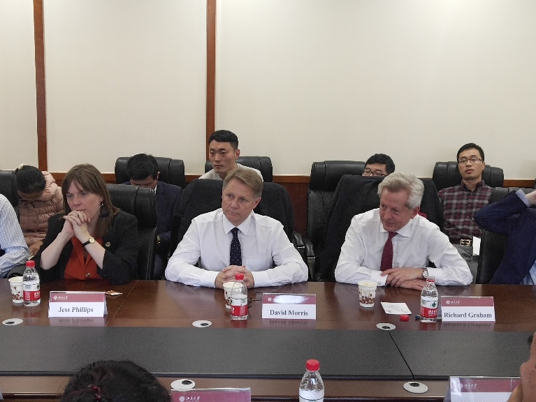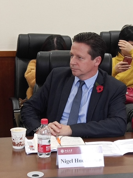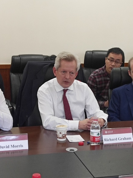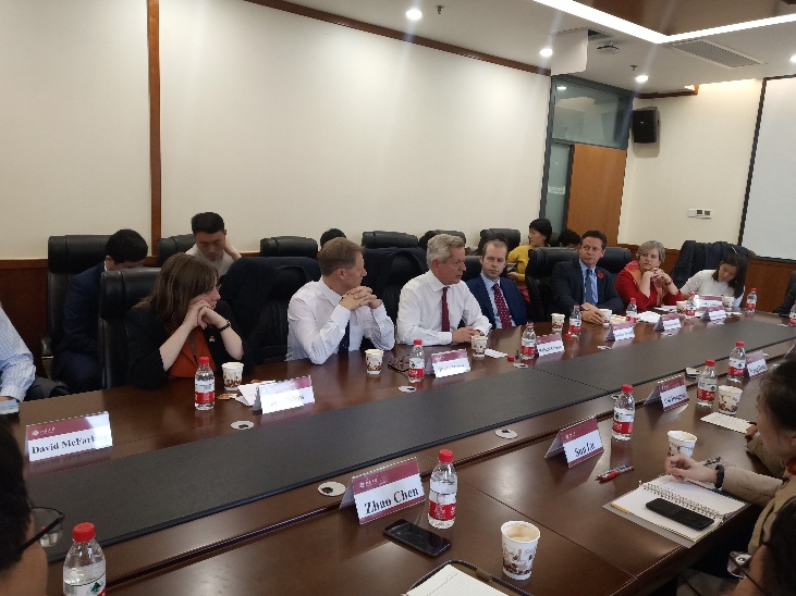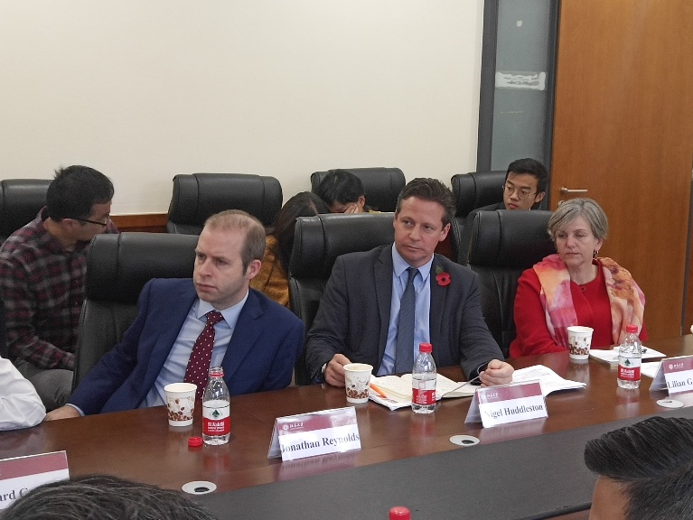 2018年11月8日下午,英国议会跨党派中国小组(APPCG)代表团在代表团主席Richard Graham带领下,到访北京大学国际关系学院并以“What will the U.K. and China look like in 20 years?”为题就中英关系、英国脱欧、国际贸易等议题与我校师生、学界、媒体界人士展开座谈。本次活动是金九论坛系列特别活动之一,会议由北京大学中美人文交流研究基地主办,北京大学国际关系学院副教授、中美人文交流研究基地执行副主任王栋主持了此次会议。