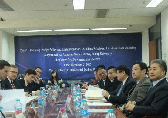 2013年11月5日上午,由北京大学美国研究中心与美国著名智库新美国安全中心(Center for a New American Security)联合举办的“中国外交政策的演变与中美关系”国际研讨会在北京大学国际关系学院C105室举行。来自北京大学、中国国际问题研究所、国防大学、军事科学院以及美国、瑞典、丹麦的近20位学者参加了这一学术研讨会。北京大学国际关系学院院长王缉思教授和新美国安全中心资深主任Patrick Cronin博士首先为研讨会致辞。王缉思教授认为国内政治和国际环境共同推动着中国外交政策的演变;Cronin博士则认为现在的中国外交政策变化吸引着国际社会的广泛关注,在此背景下,中美关系的发展与外交政策的研究尤为重要。随后,会议围绕目前中国外交政策的变化及其对中美关系的影响等问题进行了深入交流与探讨。