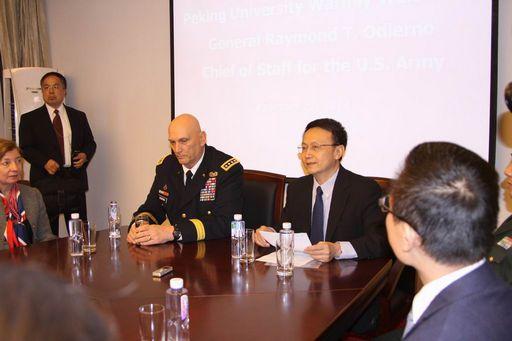 2014年2月21日下午,美国陆军参谋长雷蒙德·奥迪尔诺(Raymond Odierno)上将来访北京大学,北京大学校长王恩哥,北京大学国际关系学院院长、中美人文交流研究基地执行主任贾庆国在临湖轩一同会见了来宾一行。王恩哥校长对奥迪尔诺上将的来访表示热烈欢迎,并向其简要介绍了北京大学与美国高校的交流情况。