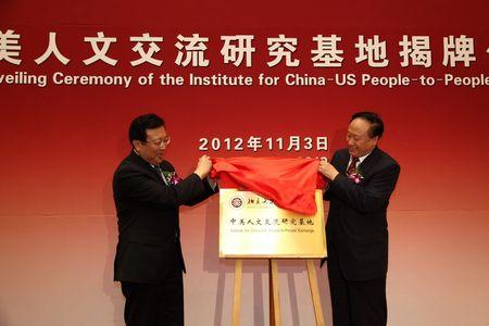 2012年11月3日下午,中美人文交流研究基地揭牌仪式在北京大学斯坦福中心李兆基大厅举行。教育部副部长郝平,北京大学党委书记朱善璐,教育部国际合作与交流司副司长杨军,中共中央党校战略研究所副所长潘悦,北京大学副校长李岩松,以及来自北京大学、清华大学、复旦大学、北京外国语大学及哈佛大学等中美高校及研究机构的专家学者出席了揭牌仪式。仪式由李岩松副校长主持。