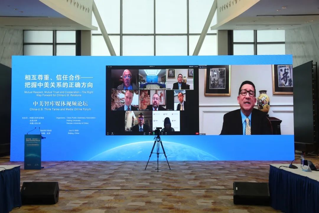 在中美关系和全球治理面临挑战的关键时期,为增进中美两国的相互理解和信任,发挥公共外交、民间外交和智库外交对于两国关系的重要意义,2020年7月9日,由中国公共外交协会、北京大学和中国人民大学共同主办的“中美智库媒体视频论坛”成功举行。北京大学中外人文交流研究基地作为主要协办方之一参与组织此次论坛。论坛以“相互尊重、信任合作——把握中美关系的正确方向”为主题。三十余位中美双方政要、前政要、知名智库专家学者、资深中外媒体负责人围绕“当前中美关系的问题与挑战”和“未来中美合作的展望与建议”展开对话。本次论坛也旨在通过沟通与学术交流,夯实中美友好互信的人文与社会基础,增信释疑,合作向前。
