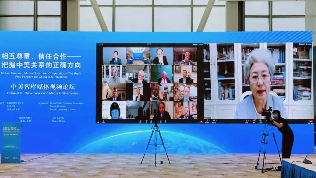 导言:在中美关系和全球治理面临挑战的关键时期,为增进中美两国的相互理解和信任,发挥公共外交、民间外交和智库外交对于两国关系的重要意义,2020年7月9日,由中国公共外交协会、北京大学和中国人民大学共同主办的“中美智库媒体视频论坛”成功举行。北京大学中外人文交流研究基地作为主要协办方之一参与组织此次论坛。论坛以“相互尊重、信任合作——把握中美关系的正确方向”为主题。三十余位中美双方政要、前政要、知名智库专家学者、资深中外媒体负责人围绕“当前中美关系的问题与挑战”和“未来中美合作的展望与建议”展开对话。本次论坛也旨在通过沟通与学术交流,夯实中美友好互信的人文与社会基础,增信释疑,合作向前。