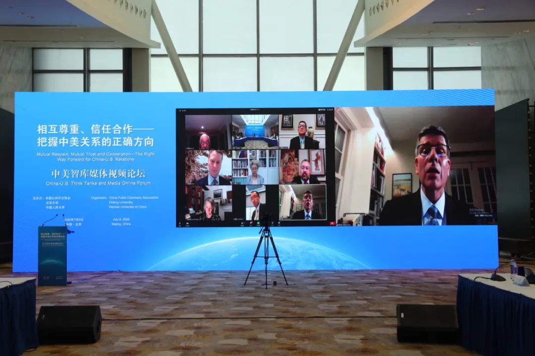 导言:在中美关系和全球治理面临挑战的关键时期,为增进中美两国的相互理解和信任,发挥公共外交、民间外交和智库外交对于两国关系的重要意义,2020年7月9日,由中国公共外交协会、北京大学和中国人民大学共同主办的“中美智库媒体视频论坛”成功举行。北京大学中外人文交流研究基地作为主要协办方之一参与组织此次论坛。论坛以“相互尊重、信任合作——把握中美关系的正确方向”为主题。三十余位中美双方政要、前政要、知名智库专家学者、资深中外媒体负责人围绕“当前中美关系的问题与挑战”和“未来中美合作的展望与建议”展开对话。本次论坛也旨在通过沟通与学术交流,夯实中美友好互信的人文与社会基础,增信释疑,合作向前。