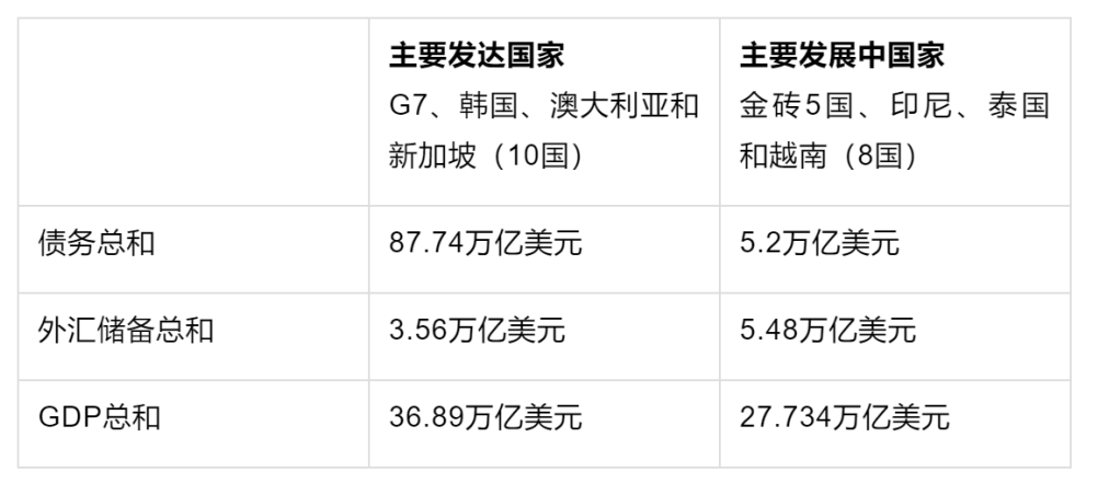 第四,经济全球化是美元霸权的基础,终结经济全球化就是终结美元霸权。下表是 2021年7国集团、韩国、澳大利亚、新加坡等10个最发达国家和金砖5国、印尼、泰国、越南等8个发展中国家的债务、外汇储备和GDP。