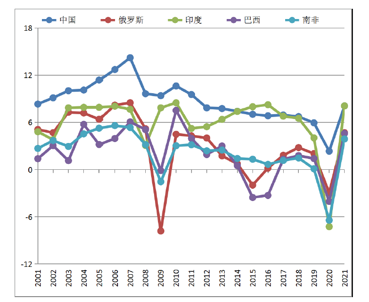 2001-2021年金砖五国经济增速(图源/《金砖,全球发展的新未来》研究报告)
