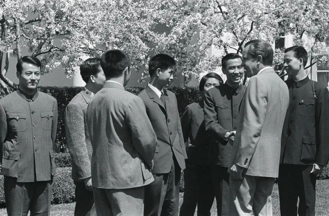 1972年4月18日,美国总统理查德·尼克松(右二)在白宫迎接中国国家乒乓球队队员