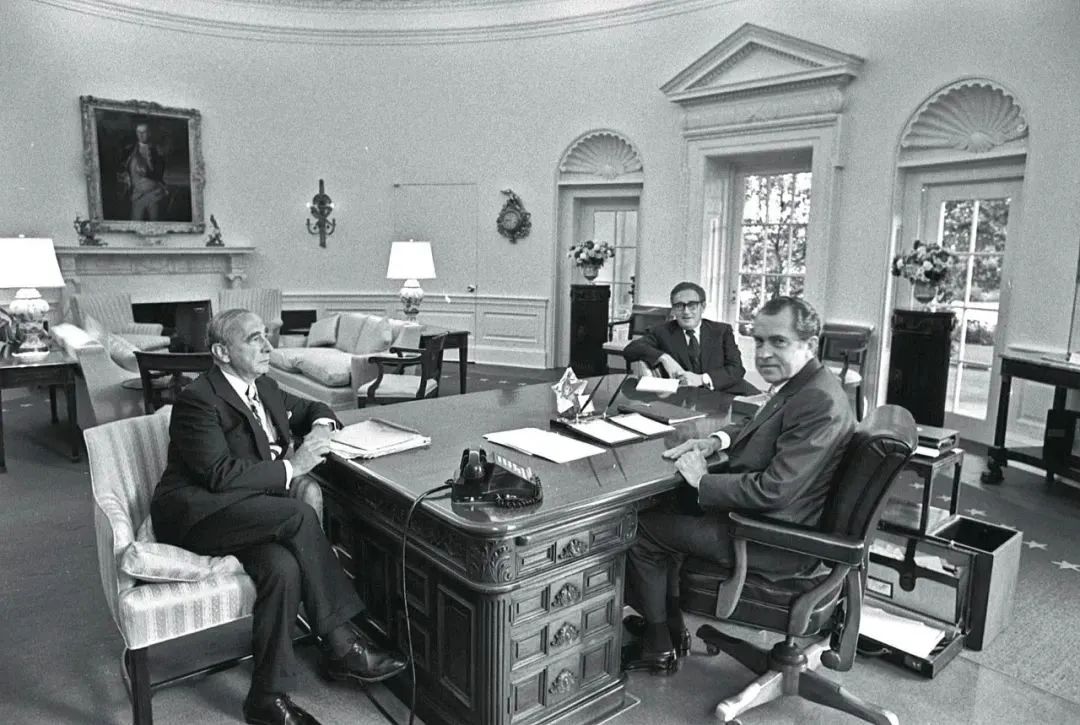 基辛格(中)进入尼克松政府后,与昔日的导师弗里茨 · 克雷默(左)以及尼克松(右)在白宫椭圆形办公室合影