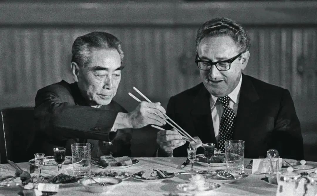 基辛格和周恩来总理在一场宴会上。凭借独特的行事方式和果敢自信,20世纪 70 年代初,基辛格迅速打开了中美外交的局面