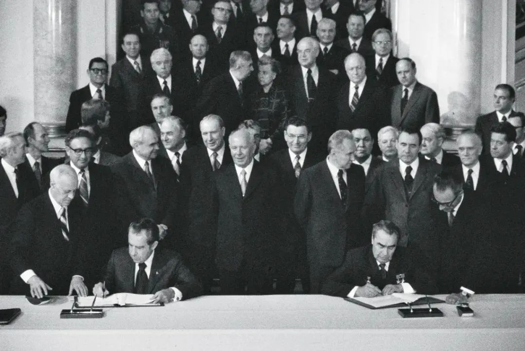 1974年6月30日,美苏莫斯科峰会期间,美国总统尼克松和苏联领导人勃列日涅夫在两国经济合作协议上签字。美国国务卿基辛格站在尼克松侧后方。