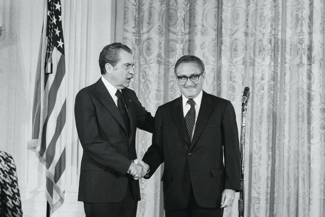 1973年9月22日,在基辛格就职国务卿的典礼上,时任美国总统尼克松(左)和他握手表示祝贺