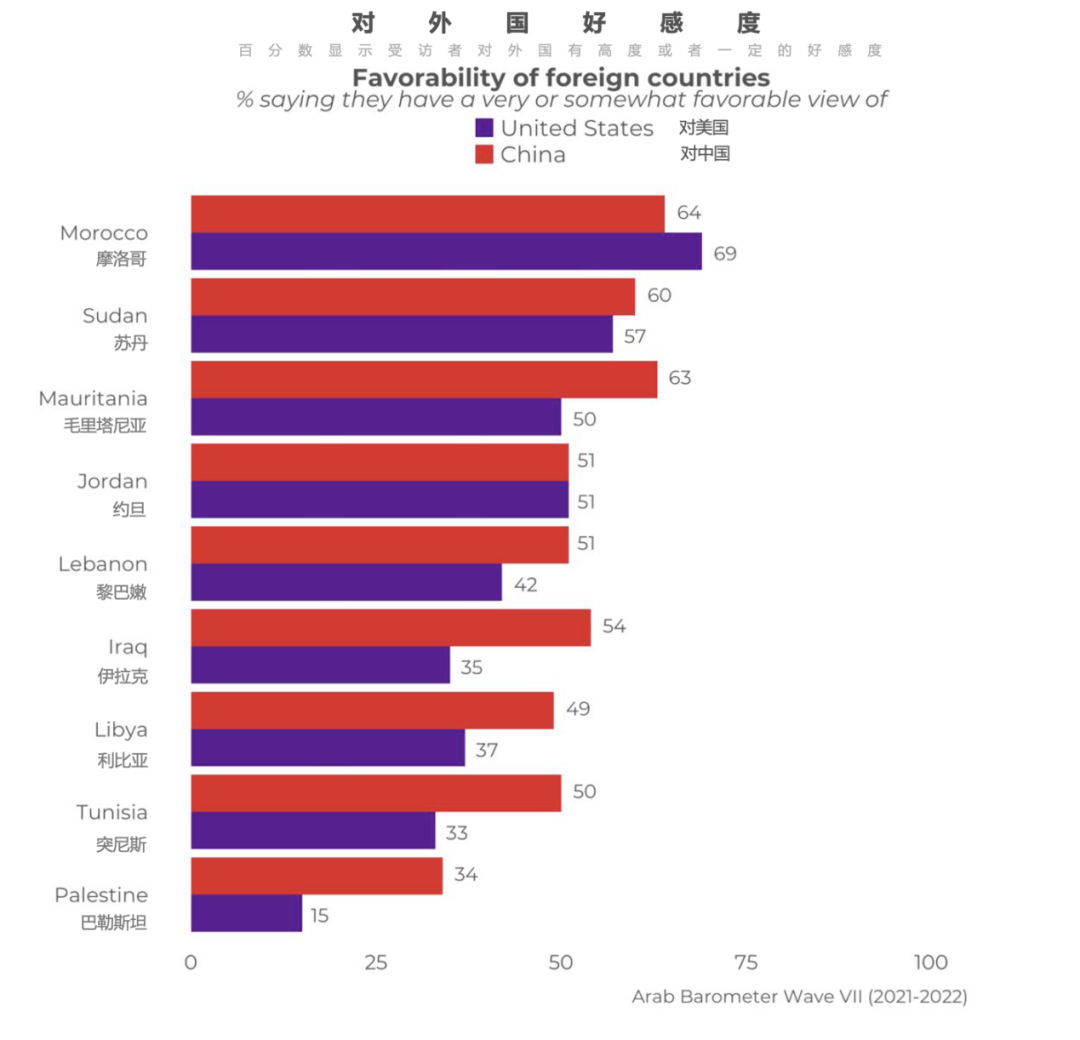 图2 2022年中东、北非地区中美受欢迎程度调查