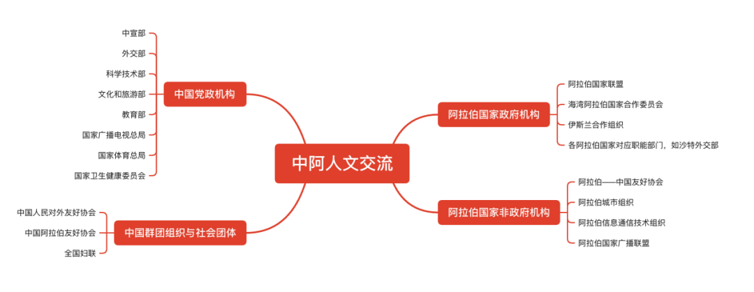 中阿人文交流由官方和民间共同推动。在官方层面,中方的主要机构包括中宣部、外交部、科学技术部、文化和旅游部、教育部、国家广播电视总局、国家体育总局、国家卫生健康委员会等;阿拉伯国家的主要机构包括阿拉伯国家联盟、海湾阿拉伯国家合作委员会、伊斯兰合作组织以及各阿拉伯国家外交、文化、科技、广播、教育、体育等领域的对应职能部门,如沙特外交部。在民间层面,中方的组织主要有中国人民对外友好协会、中国阿拉伯友好协会等;阿拉伯国家的组织主要有阿拉伯—中国友好协会联合会、阿拉伯城市组织、阿拉伯信息通信技术组织、阿拉伯国家广播联盟等。