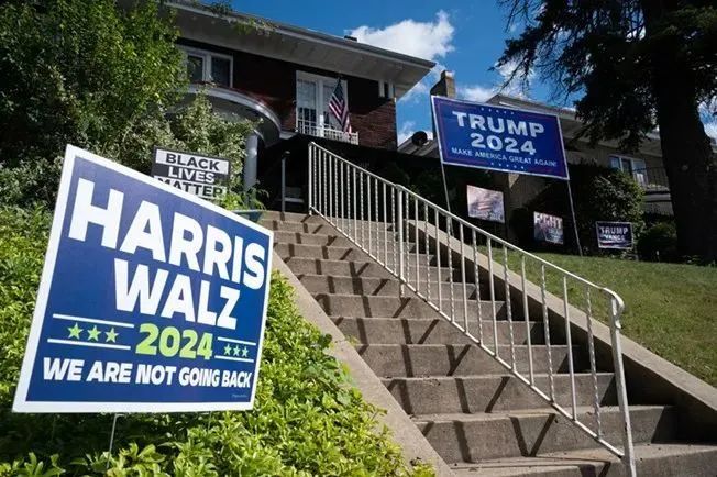 一些美国选民通过在自家前院悬挂标语、旗帜和装饰品来表达对总统候选人的支持。