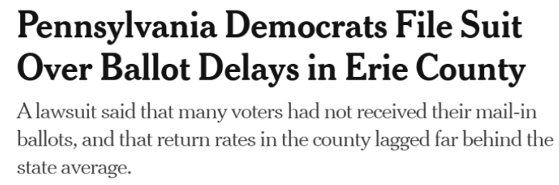 宾夕法尼亚州民主党正在寻求对伊利县选举委员会提出初步禁令,原因是邮寄选票存在问题,据称这可能影响多达20000名选民。据伊利县当地媒体报道,大约有300名选民收到了错误的选票,750张选票被邮政服务延误。在40844名申请邮寄选票的选民中,只有21536人(约占52%)在10月28日前收到选票。