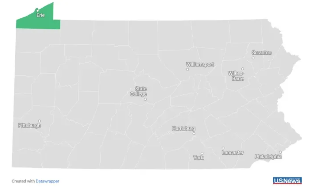 图为伊利县在宾州的位置图(左上角)。截至2024年10月21日,伊利县共有18.06万名登记选民,其中民主党约有8.12万人,约占45%;共和党约有7.18万人,约占40%。伊利县白人占比74%,约20%的人口年龄在65岁及以上,高于全国平均水平。该县蓝领阶层根深蒂固,生活水平并不富裕,家庭收入中位数为5.9万美元,低于宾州7.3万美元,低于全国的7.5万美元。