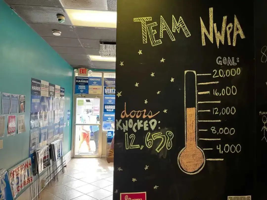 竞选办公室内一块黑板显示,团队的一个小组已经在该地区敲了12658户人家的门。图源:NPR