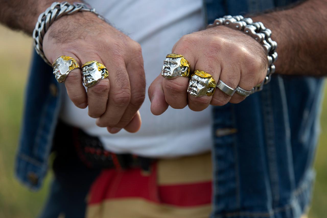 2024年10月11日,美国前总统、共和党总统候选人特朗普在科罗拉多州奥罗拉举行竞选集会。图为集会现场特朗普支持者手上的纪念戒指。