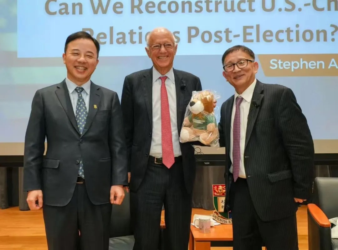 日前,主题为“美国大选后重塑中美关系的前景”的讲座在香港大学举办,美中关系全国委员会会长史蒂夫·欧伦斯(Stephen Orlins)作为主讲人分享了他对此的见解。香港大学校长张翔首先做了开场白,本场活动的主持人是香港大学当代中国与世界研究中心创始主任李成,现场聆听的学生、学者、记者众多,问答交流环节气氛热烈。