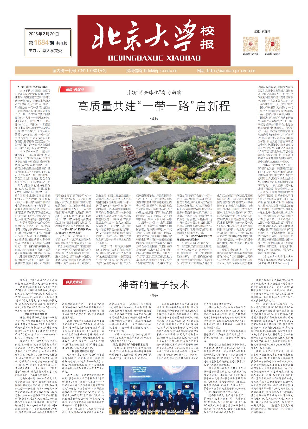 北京大学中外人文交流研究基地执行主任、国际关系学院教授王栋在《北京大学校报》头版头条撰文,题为《高质量共建“一带一路”启新程 引领“再全球化”奋力向前》。文章认为,中国正通过“一带一路”实践,为“全球南方”国家发展创造更多机遇,推动“新兴国家”成为“新型国际关系”的重要力量。此外,文章指出“一带一路”是中国引领“再全球化”的最佳例证和最优路径。“再全球化”并不是“新”全球化,而是通过内部改革来升级现有国际架构,是中国嵌入式崛起的一部分。未来,中国将“一张蓝图绘到底”,坚定不移推进高质量共建“一带一路”,携手推动构建人类命运共同体,共同建设一个持久和平、普遍安全、共同繁荣、开放包容、清洁美丽的世界。