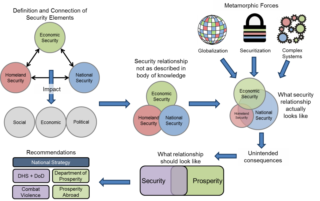 这张图展示了一个分析框架,探讨经济安全、国土安全、国家安全之间的联系及其受到全球化、安全化和复杂系统等宏观力量的影响。图源:Homeland Security Affairs