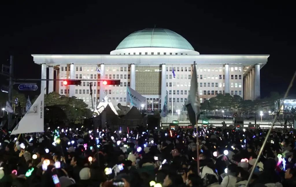 2024年12月14日,韩国民众在国会外庆祝弹劾动议表决通过。(图源:新华社)