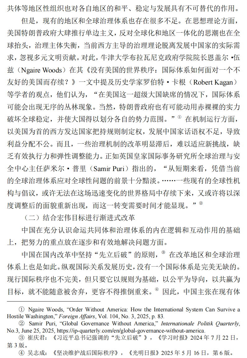 上海国际问题研究院学术咨询委员会主任、研究员,北京大学中外人文交流研究基地特约专家杨洁勉认为,这些命运共同体理念为当前的地区及全球治理体系建设指明了方向。通过将这一宏伟目标与治理体系的构建紧密结合,既能让命运共同体建设的宏伟目标得以“落地”,也能使地区和全球治理体系的建设保持在正确的方向上。杨洁勉认为,建设亚洲命运共同体与地区、全球治理体系是一项世纪工程,需要亚洲和世界各国及其人民的长期不懈奋斗和整个国际社会的积极配合和共同努力,要不断增强亚洲的综合实力,增强与域外国家互动的能力,更需要加强与全球治理体系的基础性、有效性和创造性互动。