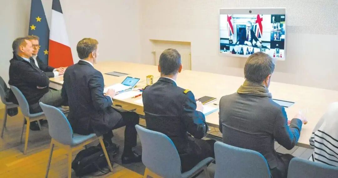 法国总统马克龙在巴黎与英国、乌克兰以及欧盟委员会、北约等20多个国家和地区组织的领导人召开视频会议(图源:IC photo)