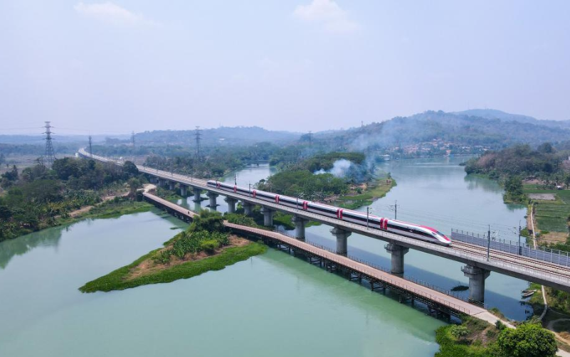 中印尼两国高度关注的共建“一带一路”旗舰项目:在印度尼西亚普哇加达拍摄的一列行驶中的雅万高铁高速动车组(图源:新华网)