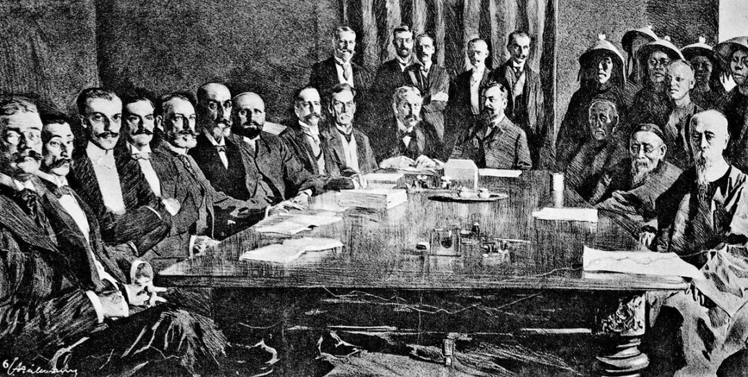 1901年9月7日,奕劻(右坐一)、李鸿章(右坐二)与英、俄、美、德、日、法、奥、意、西、荷、比十一国代表在北京签订《辛丑条约》(图源:中国文化研究院)
