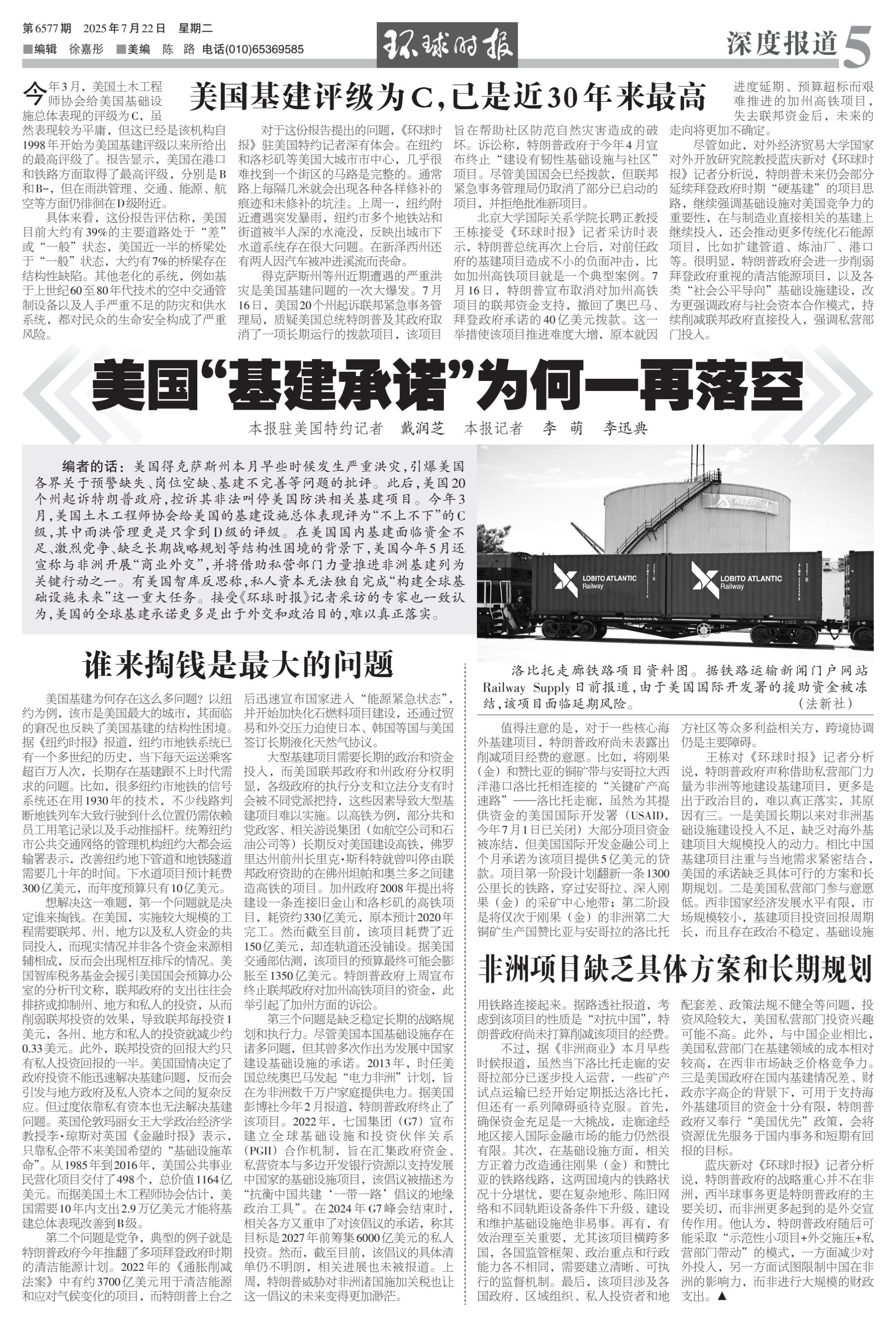 美国得克萨斯州本月早些时候发生严重洪灾,引爆美国各界关于预警缺失、岗位空缺、基建不完善等问题的批评。此后,美国20个州起诉特朗普政府,控诉其非法叫停美国防洪相关基建项目。今年3月,美国土木工程师协会给美国的基建设施总体表现评为“不上不下”的C级,其中雨洪管理更是只拿到D级的评级。在美国国内基建面临资金不足、激烈党争、缺乏长期战略规划等结构性困境的背景下,美国今年5月还宣称与非洲开展“商业外交”,并将借助私营部门力量推进非洲基建列为关键行动之一。有美国智库反思称,私人资本无法独自完成“构建全球基础设施未来”这一重大任务。
