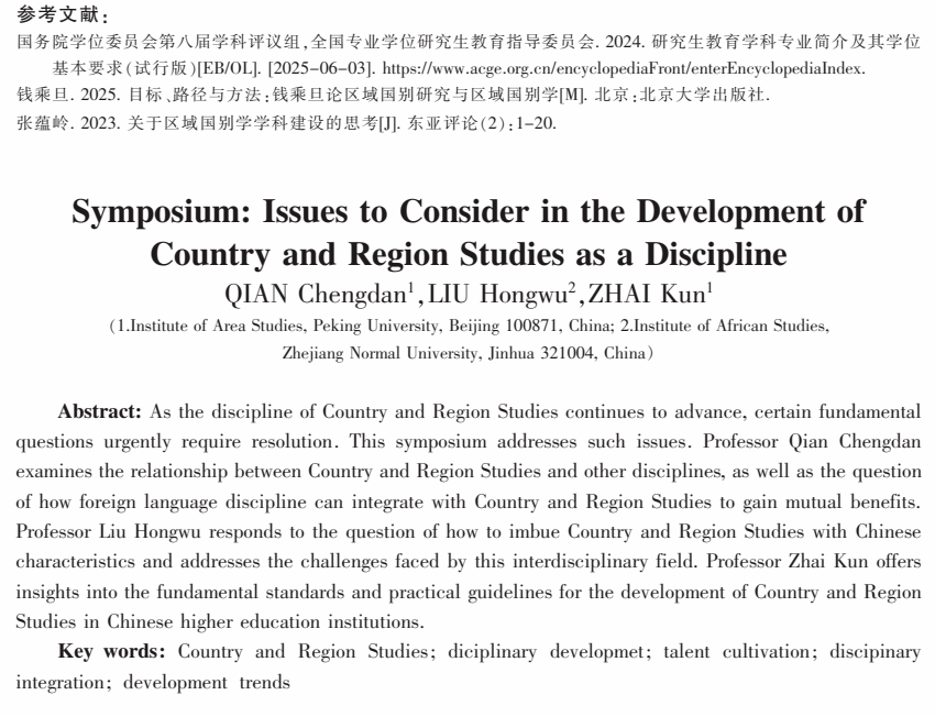 在中国不断推进高水平对外开放和深度参与全球治理的大背景下(张蕴岭 2023),区域国别学学科建设从理论层面到实践层面都需要加快推进。在本次笔谈中,钱乘旦教授围绕区域国别学与外语学科的关系,以及如何实现两者的融合双赢进行解读,着重阐释“三外、三知、三实”的方法论及“通才+专才”的人才培养目标;刘鸿武教授系统梳理区域国别学的发展脉络、中国传统学术智慧对其的滋养、中国共产党人的区域研究实践,以及该学科所面临的问题与未来发展方向,并结合自身深入研究非洲的实践经验,提出学科建设和务实人才培养的创新路径;翟崑教授从基本规范和实操指南两个维度展开论述,剖析了区域国别学学科建设的核心规范要素、三级管理体系、实操关键路径及难点破解,并结合北京大学的实践案例,阐释了何为及如何守正创新。这些见解当有助于筑牢中国特色区域国别学的根基,促进其持续健康发展。