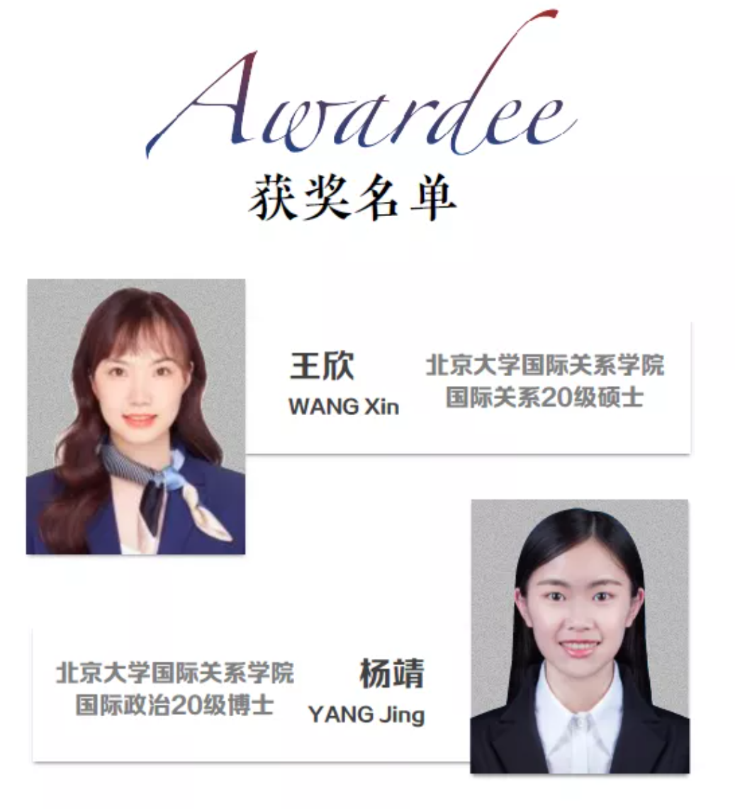 经由北京大学中外人文交流研究基地组织学者、专家,会同中美教育基金会代表以及苏珊·伯杰(Mrs. Susan Berger)女士对诸位候选人的多轮联合筛选后,两位品德优异、成绩突出、具有扎实的学术专业基础及清晰合理的未来职业规划的同学通过最终评选,成为2021年北京大学国际关系学院伯杰纪念奖学金获奖者。